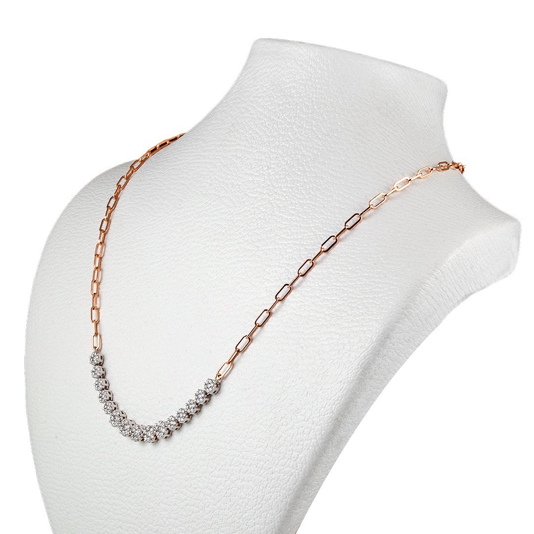 The fusion of rose and white gold elevates the necklace’s design, creating a striking balance between warmth and brightness. The refined goldwork enhances the beauty of the diamonds, allowing them to shimmer from every angle. The intricate craftsmanship ensures lasting durability while maintaining a light and graceful wearability. Every curve and contour of this necklace is thoughtfully designed to capture the essence of sophistication.