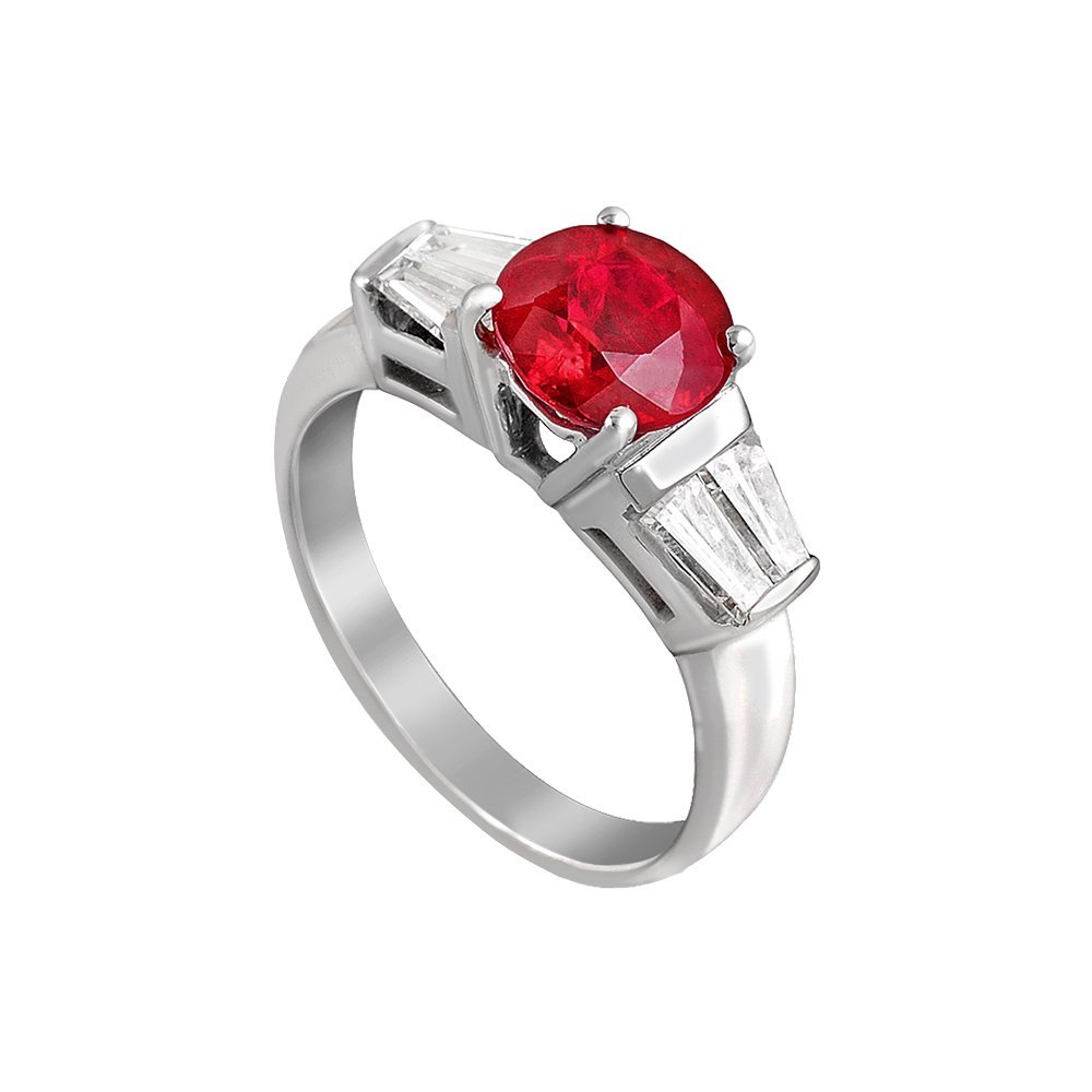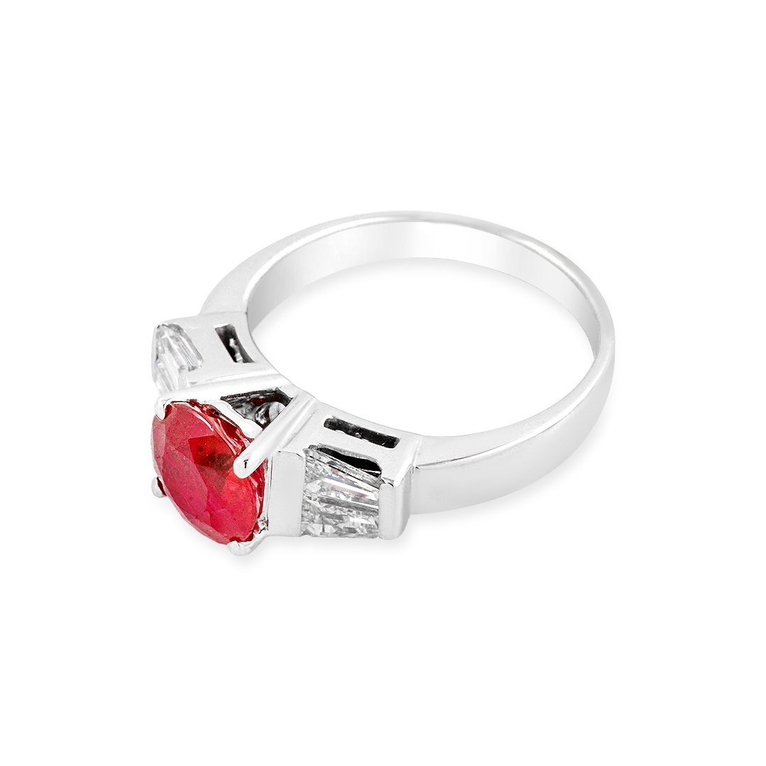Flanking the ruby, four baguette-cut diamonds add an extra layer of brilliance to this ring’s design. With a total weight of 0.69 carats, these diamonds are carefully selected for their exceptional VVS2 clarity and H color. Their precise cut and arrangement enhance the overall composition, offering a refined sparkle that complements the rich tones of the centerpiece. The geometric elegance of the baguette diamonds adds a contemporary touch to this timeless design, ensuring lasting sophistication.