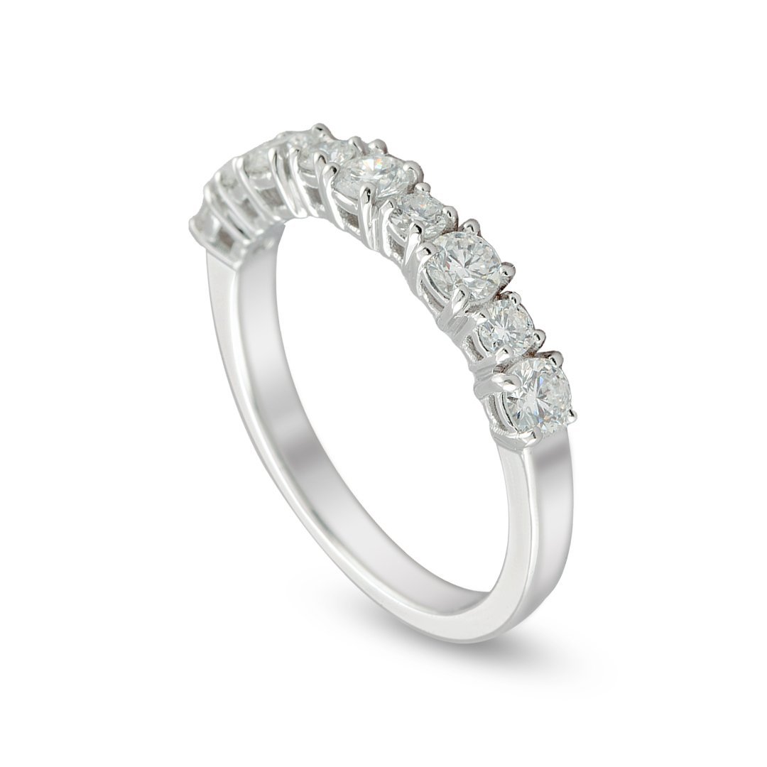 Nine round brilliant diamonds, totaling 0.75 carats, illuminate this 18k White Gold Diamond Band with captivating fire and brilliance. Each diamond, carefully selected for its VS1 clarity and G color, ensures remarkable light reflection, creating an enchanting display with every movement. The exquisite arrangement enhances the ring’s luminous appeal, adding a refined touch of radiance.
