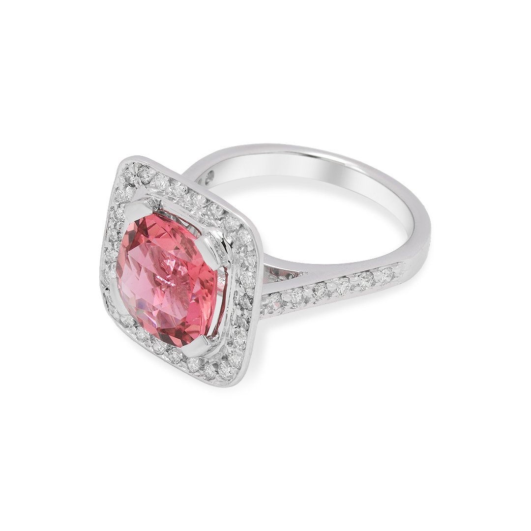 Surrounding the center, thirty nine round brilliant diamonds add layered sparkle. Twelve diamonds totaling 0.23 carats enhance structure and balance. Additionally, twenty seven diamonds totaling 0.29 carats complete the luminous arrangement. All diamonds are graded VS2 in clarity and G in color. Therefore, brilliance appears clean and consistent throughout. Their precise placement allows light to move freely. As a result, the ring radiates controlled sparkle from every angle. The diamonds complement the tourmaline without overpowering it. Consequently, this 18k white gold diamond and tourmaline ring offers harmony, refinement, and enduring sophistication for distinctive everyday and statement wear.
