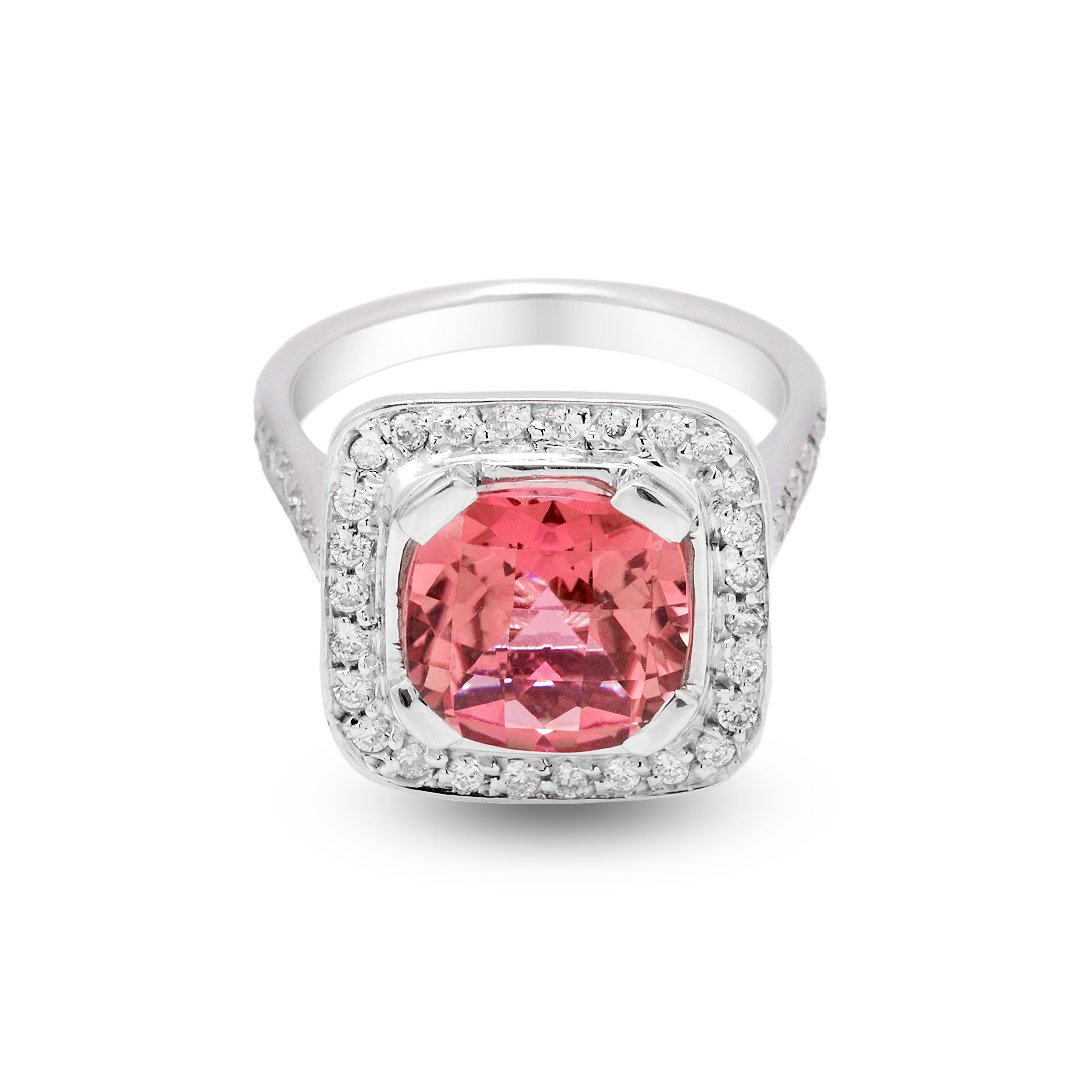At the heart of the ring, a natural tourmaline weighing 3.88 carats commands attention. Its generous size creates a bold yet refined focal point. Moreover, the stone’s natural character enhances individuality and depth. Light interacts smoothly across its surface. Therefore, the tourmaline displays vibrant presence without excess. The white gold setting frames it beautifully. As a result, the center stone remains balanced within the composition. This thoughtful proportion reinforces elegance and confidence. Additionally, the natural tourmaline introduces distinctive charm. Consequently, the ring expresses artistic refinement and timeless gemstone beauty.