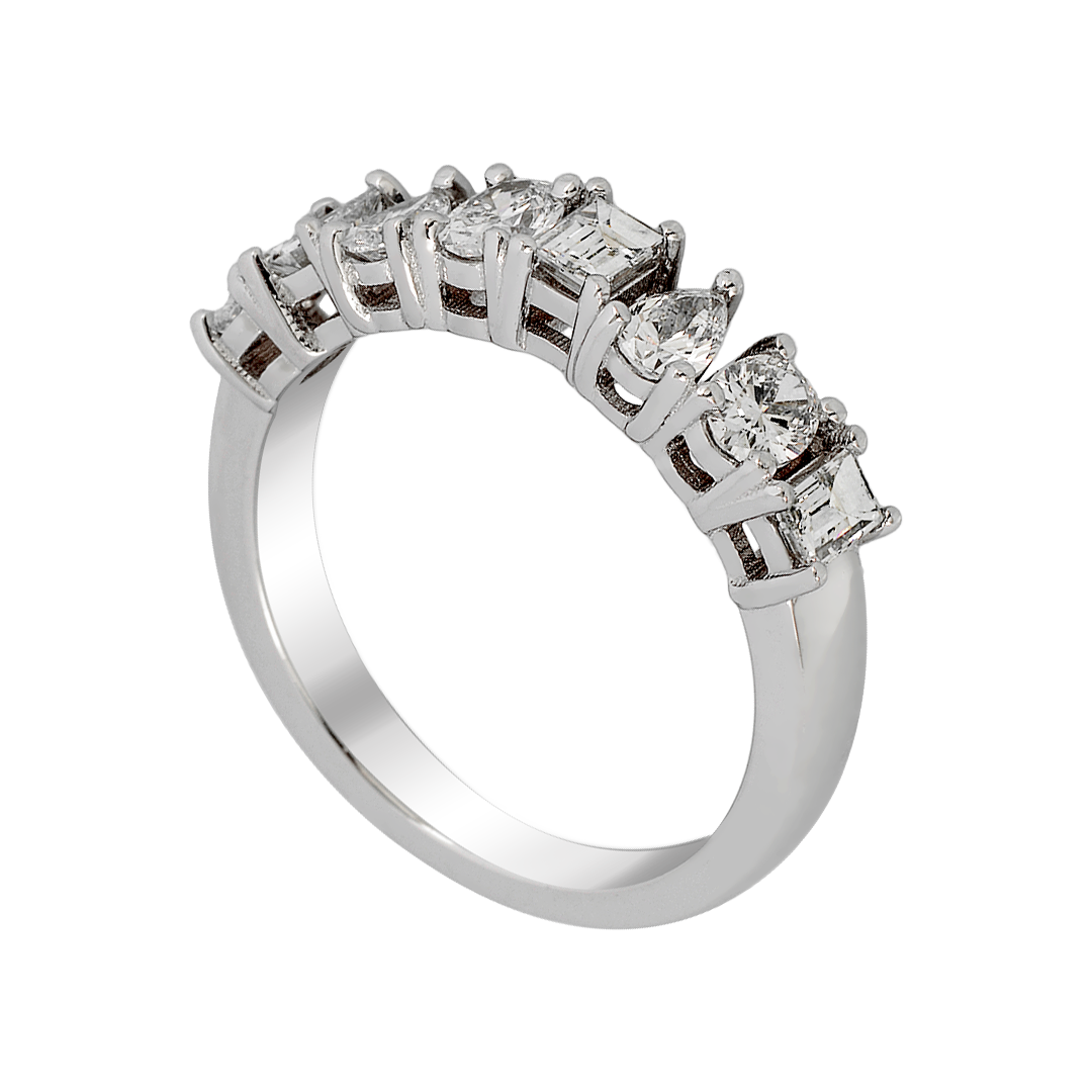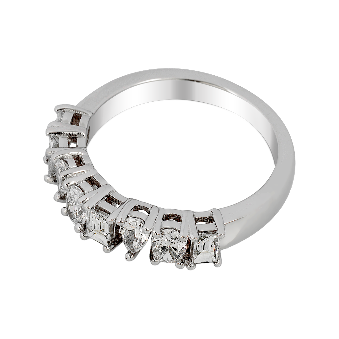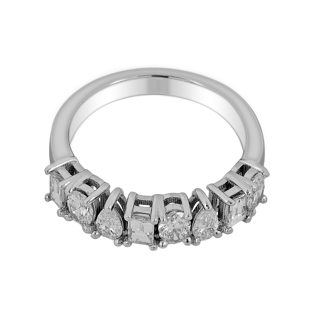 Showcasing three oval diamonds totaling 0.46 carats, two pear-shaped diamonds weighing 0.23 carats, and three baguette-cut diamonds adding 0.37 carats, this band offers a dynamic interplay of light. Each diamond, with VS1 clarity and G color, is precisely selected to ensure maximum brilliance and fire. The varied cuts create a captivating balance between soft curves and sleek lines, elevating the ring’s visual appeal.