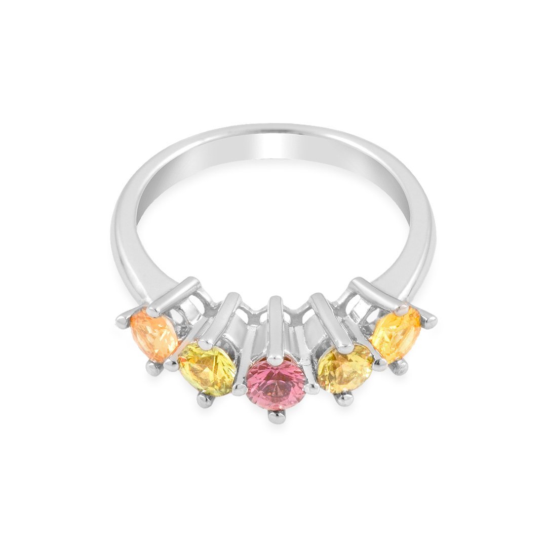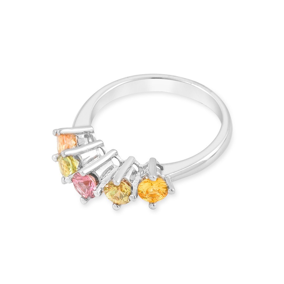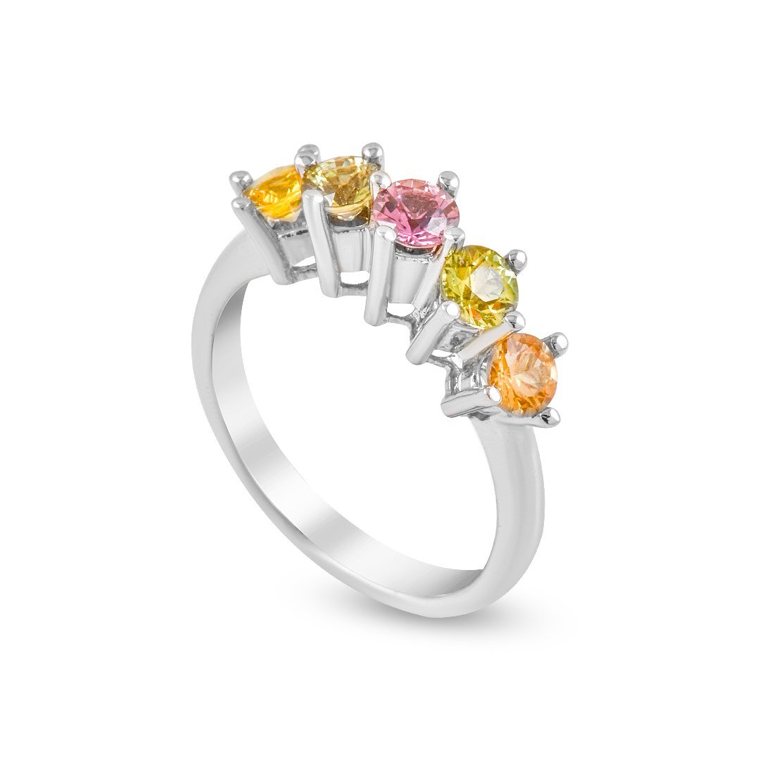 This 18k white gold sapphire band is a stunning expression of elegance and individuality. Featuring five natural sapphires, it showcases a mesmerizing blend of colors. Each gemstone radiates with a unique vibrance, adding depth and character to the design. The cool sheen of white gold enhances the brilliance of the sapphires, creating a refined yet captivating look. Whether worn as a statement piece or paired with other rings, this band embodies sophistication with a modern touch.
