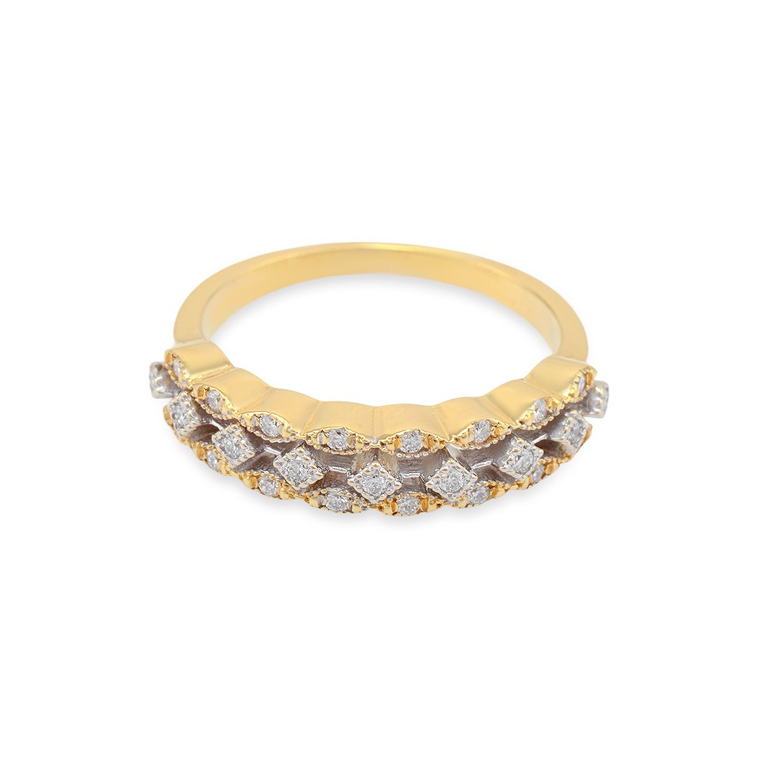Adorned with 25 round brilliant diamonds, this band features a total of 0.20 carats. Each diamond is carefully selected for its exceptional quality, offering VS1 clarity and G color. The diamonds emit a dazzling sparkle that contrasts beautifully against the yellow and white gold, adding depth and brilliance to the piece. Their precise cut ensures they shine brightly, creating an eye-catching display of light and elegance.