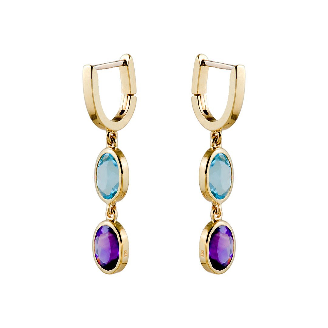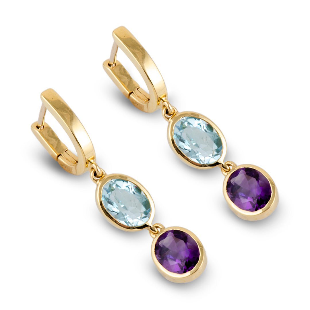 18K Yellow Gold Blue Topaz and Amethyst Earrings