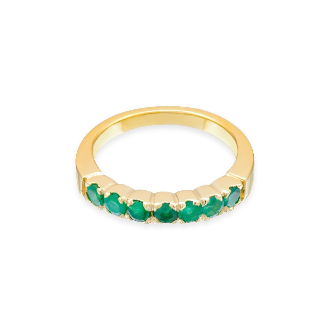 With a gold weight of 4.25 grams, this 18k yellow gold emerald band offers both luxury and comfort. The seven natural emeralds, totaling 0.85 carats, are precisely set to enhance their brilliance. Their arrangement creates a continuous flow of color, making the band a striking yet balanced piece. The warmth of yellow gold complements the lush green tones of the emeralds, resulting in an elegant contrast. Every detail reflects masterful craftsmanship, ensuring a flawless and enduring design.