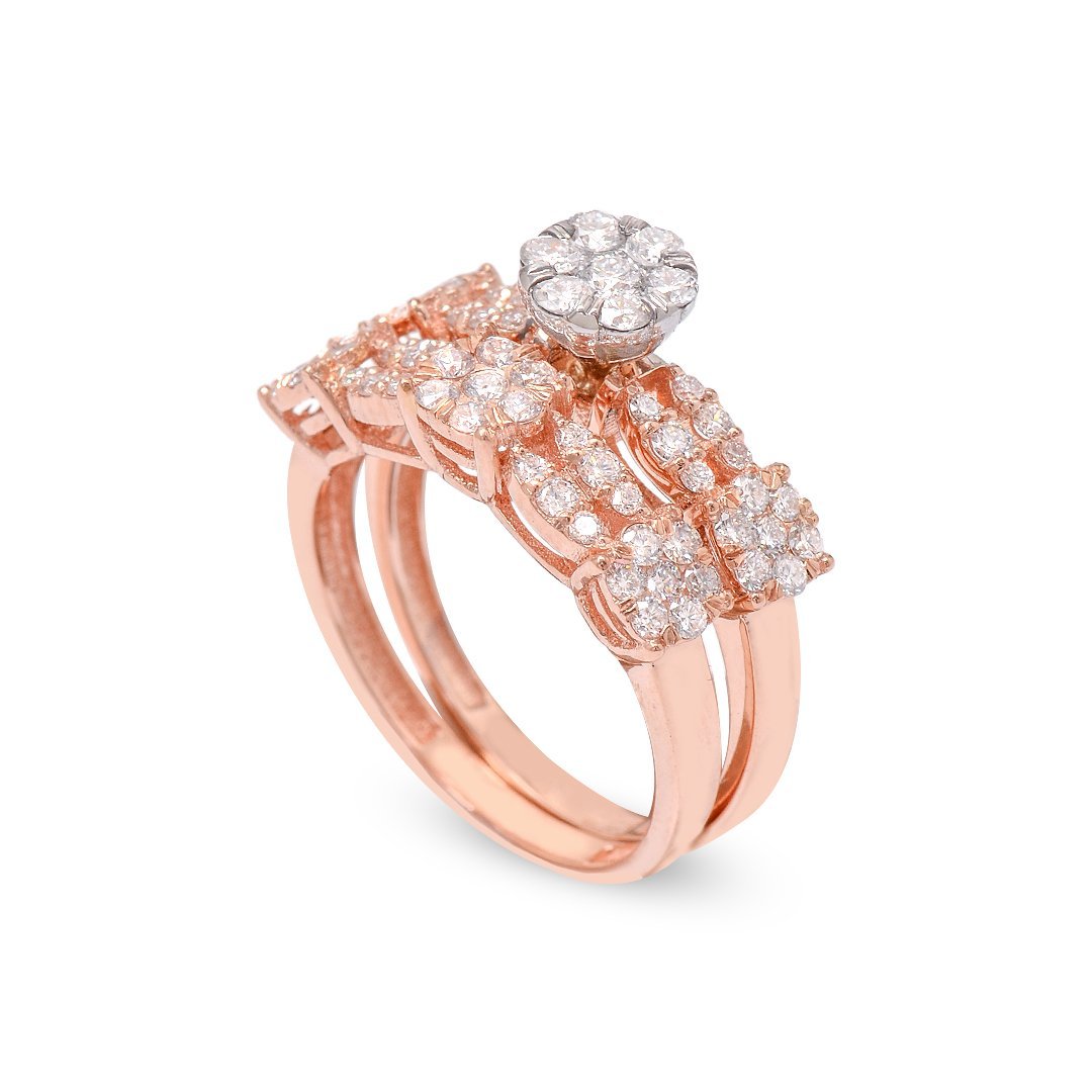 This rose and white gold diamond bridal set captures the essence of sophistication. The engagement ring, crafted from radiant 18k rose and white gold, blends warmth and brilliance for a refined look. Its seamless design enhances the natural beauty of each element, creating a stunning harmony. The matching band, made from luminous 18k rose gold, complements the solitaire perfectly. Together, they form a breathtaking duo, ideal for those who cherish timeless elegance with a touch of modern charm. Whether worn separately or as a set, each piece enhances every moment with effortless beauty.