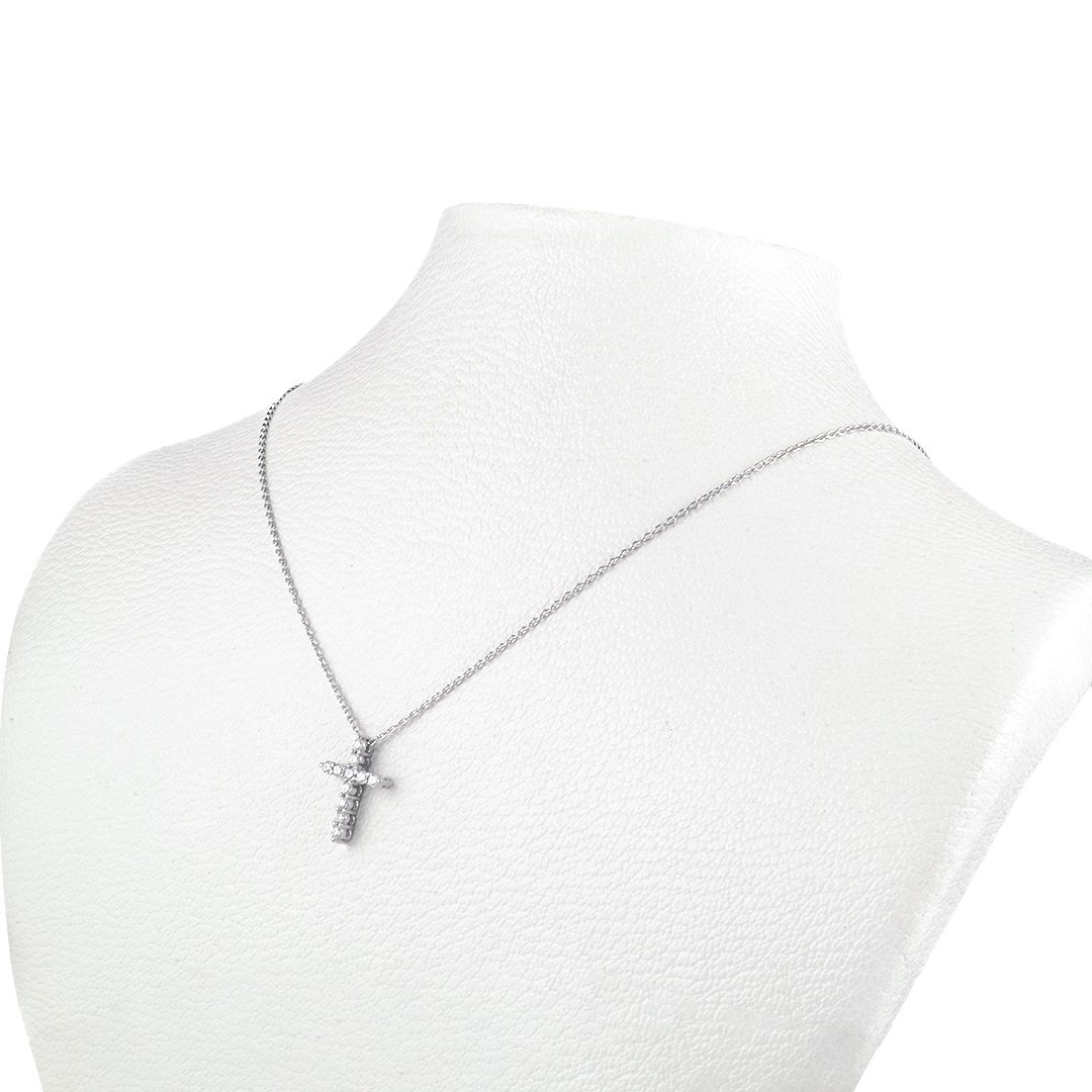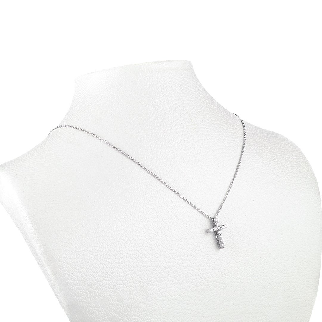 This Cross Diamond Necklace is crafted in 18k white gold and weighs 2.92 grams. Eleven round brilliant diamonds, totaling 0.28 carats, adorn the piece. Each diamond is VS1 clarity and G color. They catch light beautifully. The result is a subtle sparkle that elevates any look.