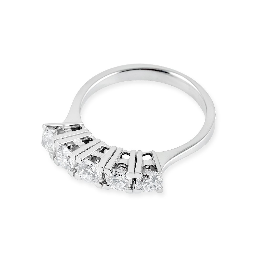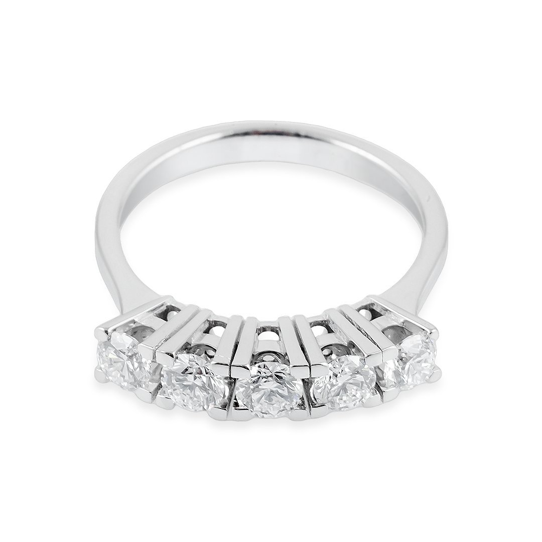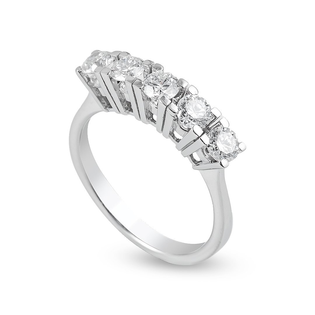 Elevate your elegance with the Elegant Five-Diamond White Gold Band. This sophisticated piece features five round brilliant diamonds, totaling 0.97 carats, set in 18K white gold. The diamonds, with VS1 clarity and G color, emit a radiant brilliance, embodying understated luxury and timeless appeal.