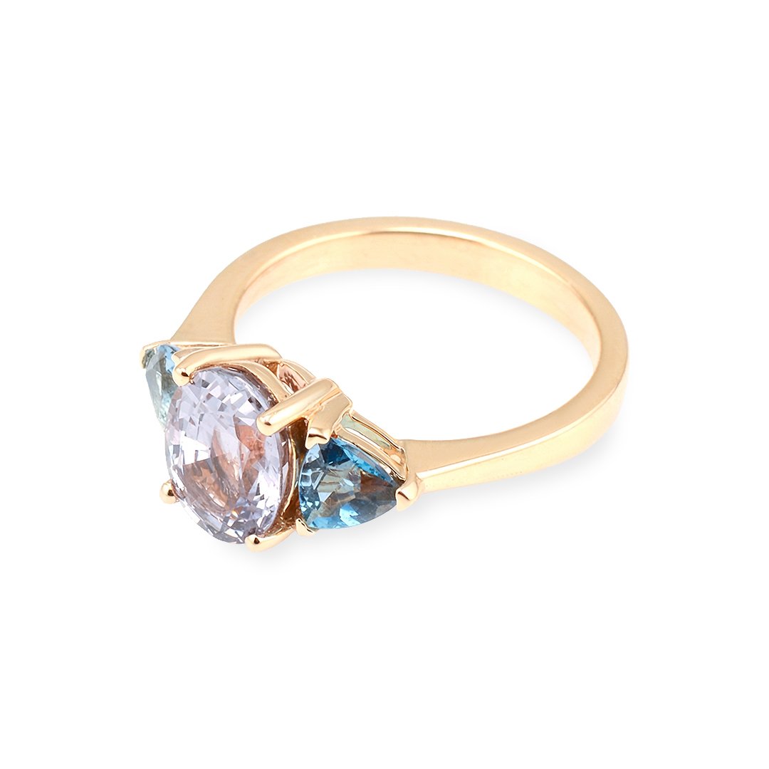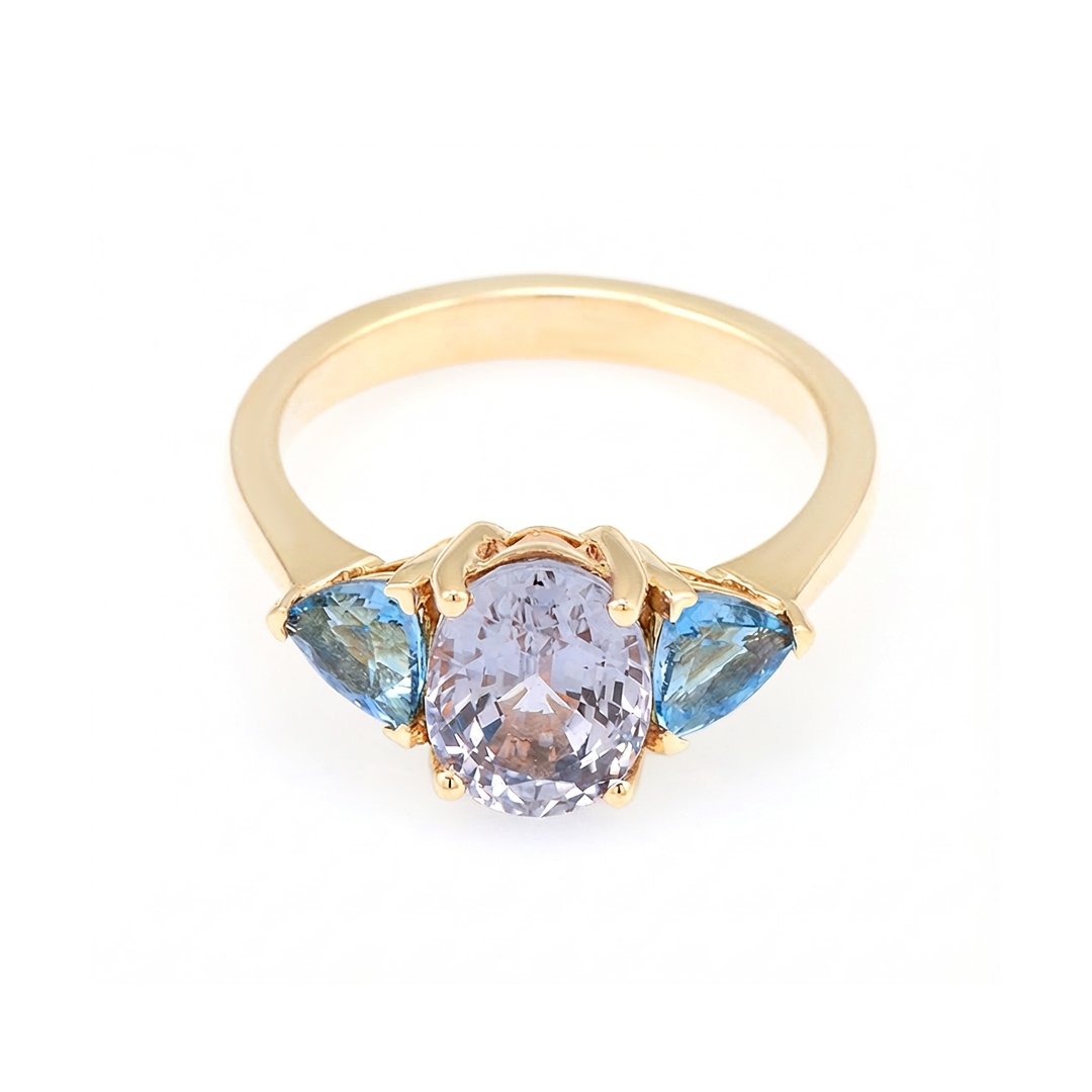 Two natural aquamarines total 0.76 carats and frame the center. Their softer blue tones introduce cool contrast and clarity. In addition, they add visual relief and subtle movement. Together, the stones form a balanced color story that feels composed and elegant.