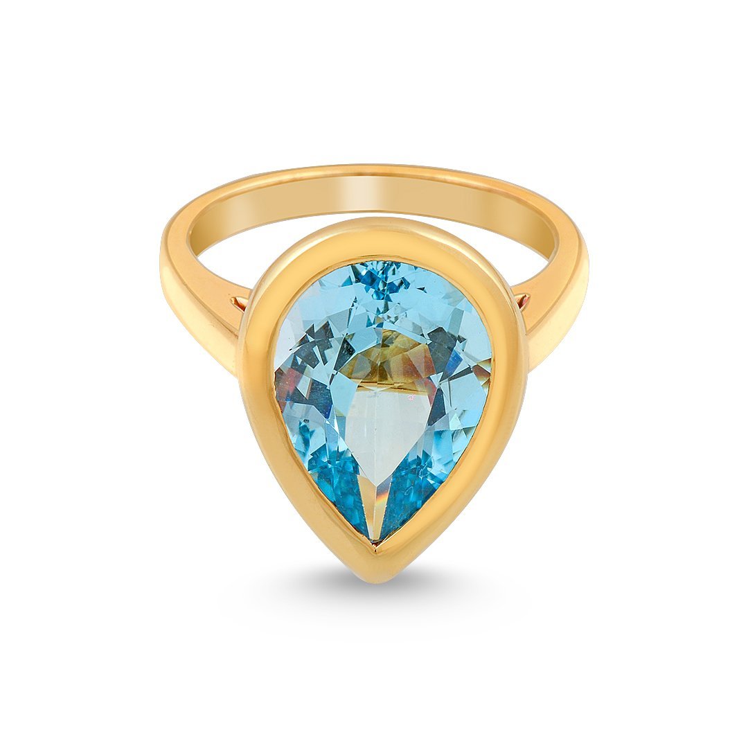 The blue topaz is expertly set in a sleek yellow-gold band, enhancing its vivid color. The contrast between the rich yellow of the band and the cool blue of the gemstone offers a harmonious balance that elevates the design. Carefully crafted to perfection, this ring combines timeless luxury with modern style, making it a versatile addition to any jewelry collection.