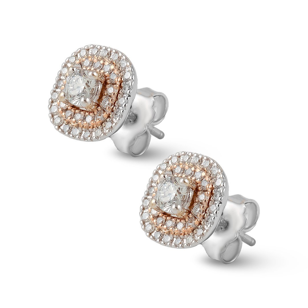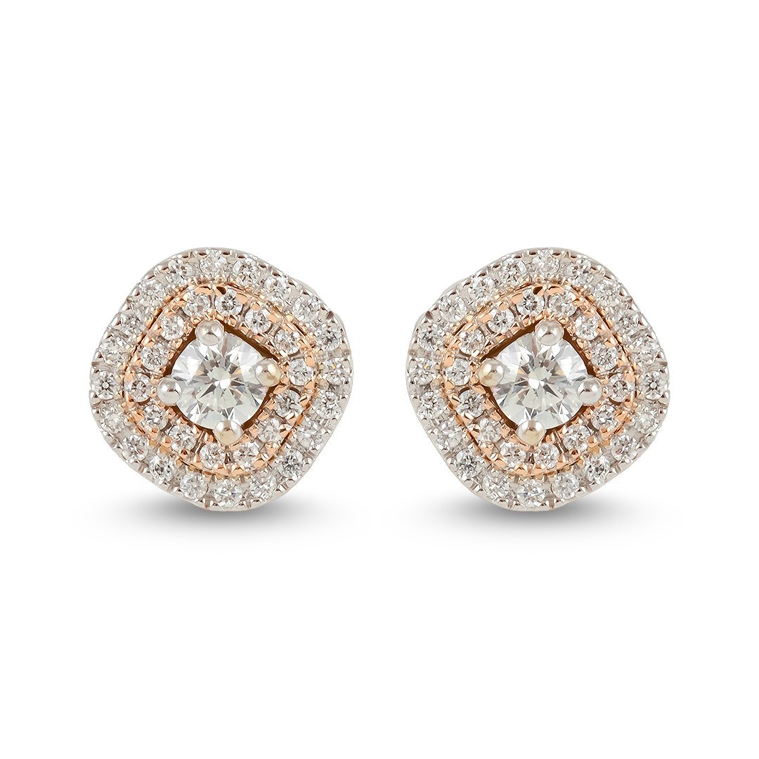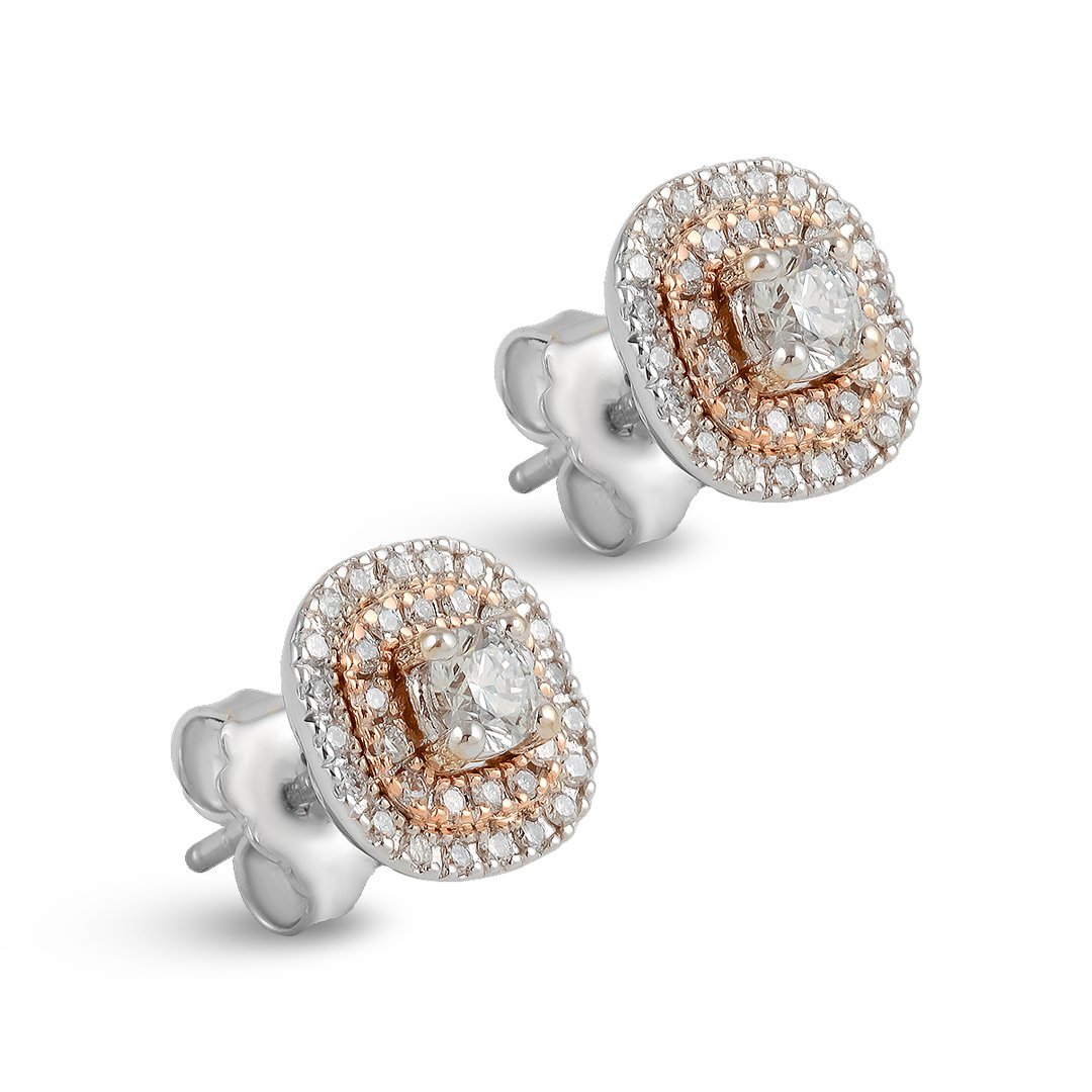 These exquisite 18k white and rose gold earrings offer a breathtaking fusion of elegance and brilliance. The centerpiece of the design features two round brilliant diamonds, totaling 0.40 carats, with VS1 clarity and G color. Each diamond sparkles with exceptional brilliance, creating a captivating focal point. Surrounding these central stones, 68 additional round brilliant diamonds, totaling 0.37 carats, enhance the overall radiance of the earrings, ensuring that every angle catches the light beautifully. The careful arrangement of diamonds ensures an exceptional display of light and fire, making these earrings truly unforgettable.