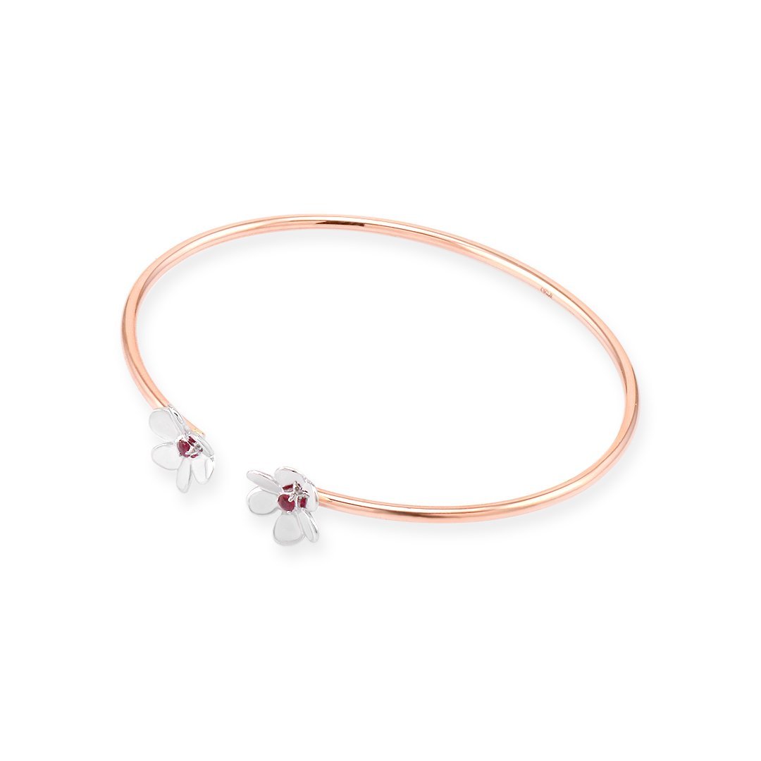 Graceful, modern, and romantic, this rose and white gold floral ruby bangle invites admiration. With its elegant use of tone, shape, and gemstone detail, it speaks softly yet memorably. Designed for those who cherish subtle beauty, it celebrates femininity through quiet sophistication.