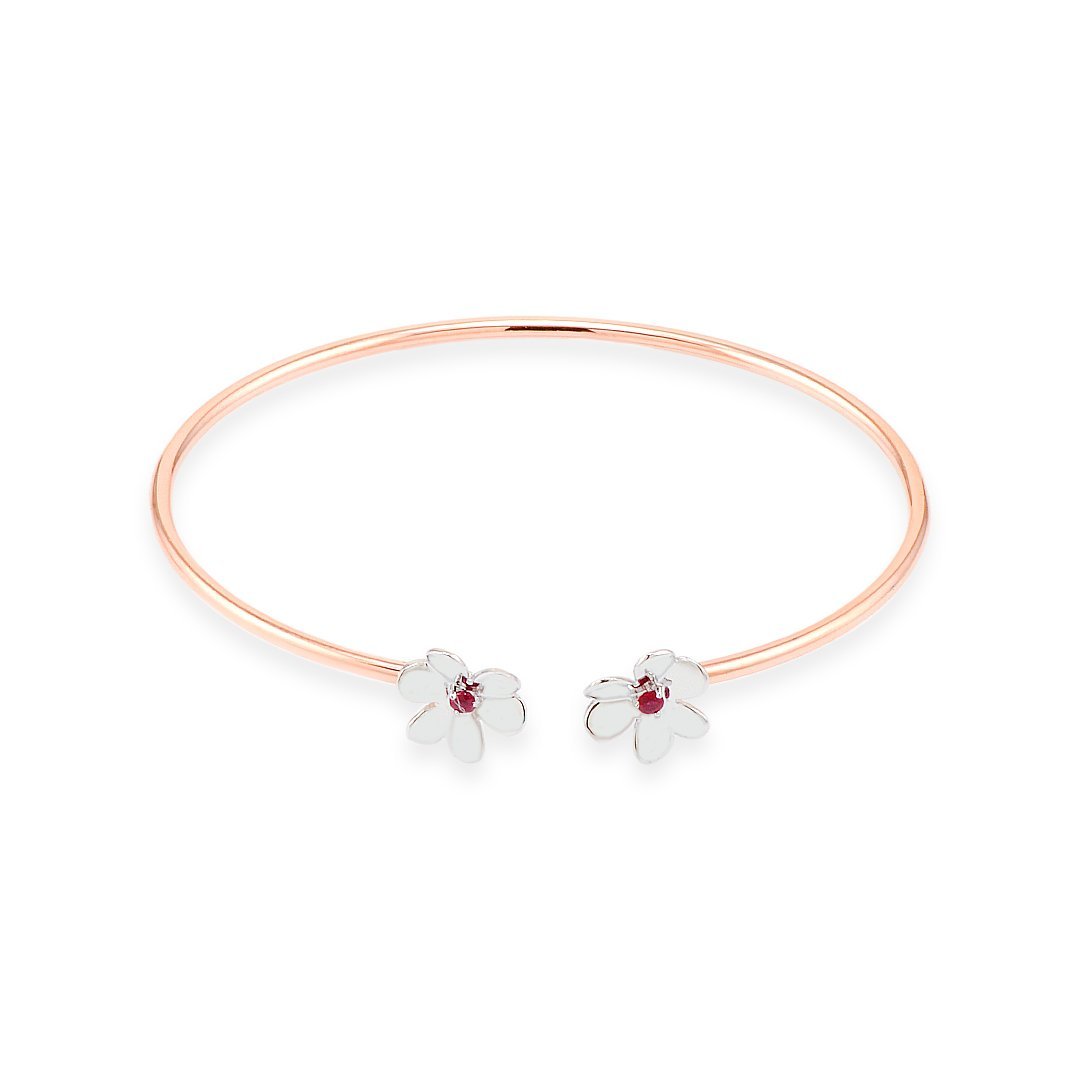 This rose and white gold floral ruby bangle brings grace to life with delicate design and feminine detail. Sculpted in 18k gold, it blends the warmth of rose gold with polished white gold accents. Its slender, open form curves gently around the wrist, offering a refined and modern silhouette that flatters the hand without effort. Light in feel, yet rich in character, this piece tells a quiet story of elegance.