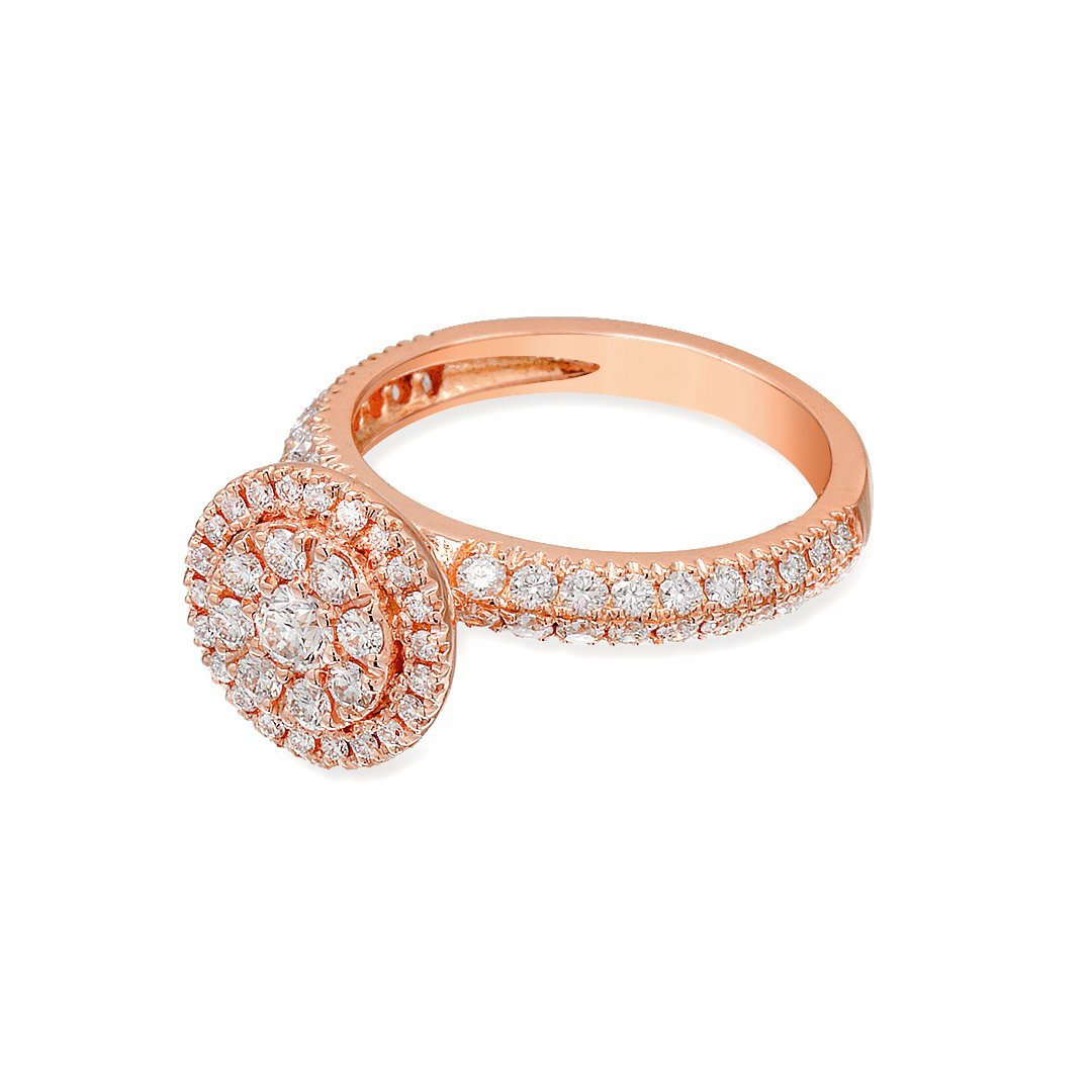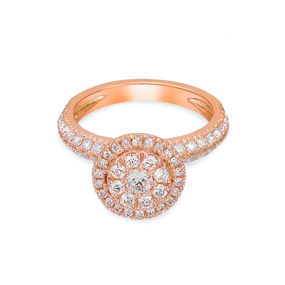 This rose gold diamond solitaire ring blends romance with refined brilliance. Crafted in 18k rose gold, it carries a warm hue that feels both modern and timeless. Its sculptural form makes a soft yet bold statement, ideal for women who appreciate elegance with a twist. Whether worn alone or paired with other rings, it delivers a graceful presence that never fades. Its warmth suits all skin tones and enhances the sparkle of each stone.