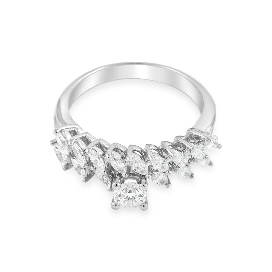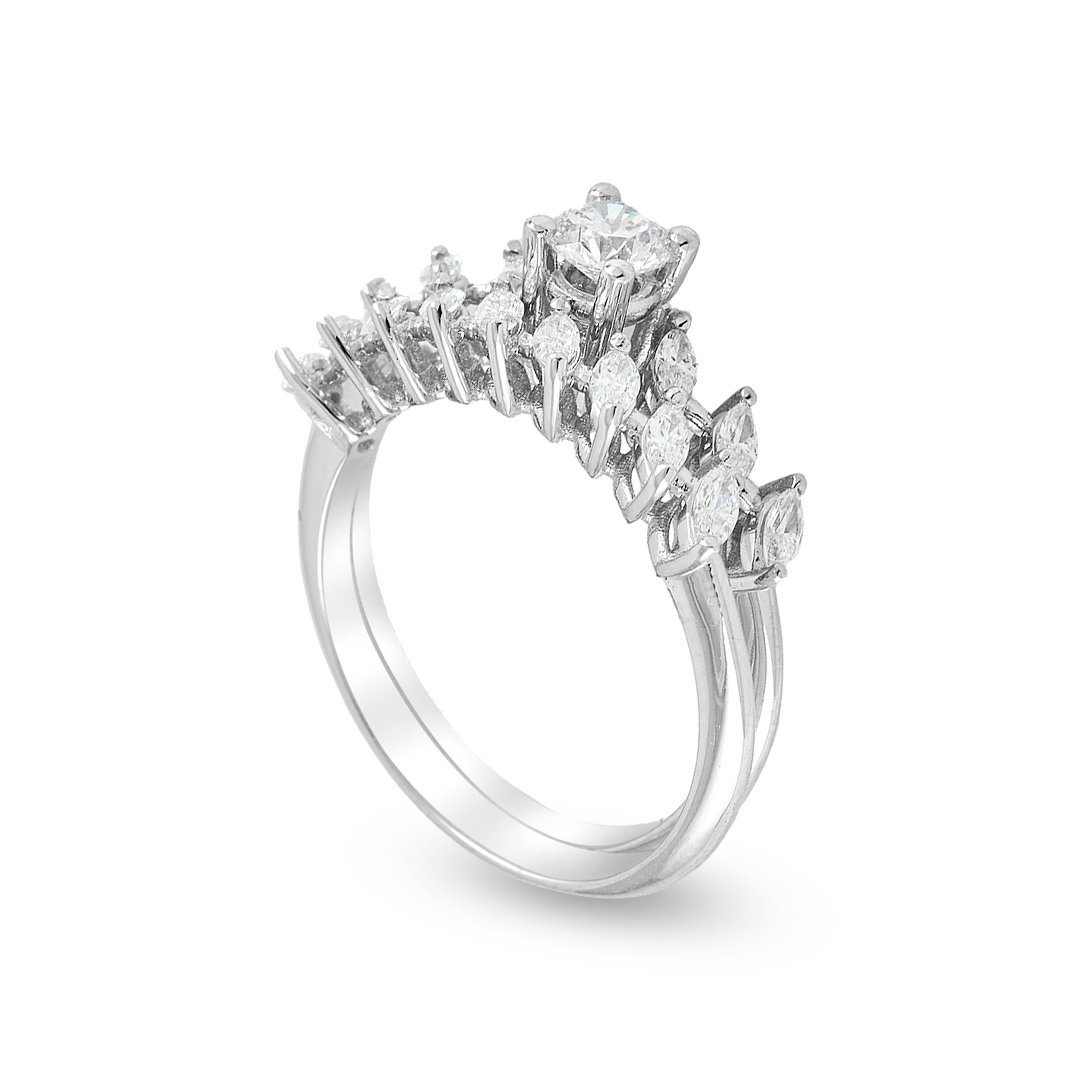 This 18k white gold diamond ring set unites beauty with refined craftsmanship. It merges the Whisper of Light Solitaire and the Eternal Grace Band. First, the solitaire holds a 0.31-carat round brilliant diamond. Next, six marquise diamonds encircle it with a gentle flair. Together, these stones form a stunning focal point. Moreover, each diamond shows VS1 clarity and G color. Consequently, the design exudes radiance and charm. In addition, the setting highlights each stone’s fire and brilliance. Thus, the piece feels both modern and timeless.