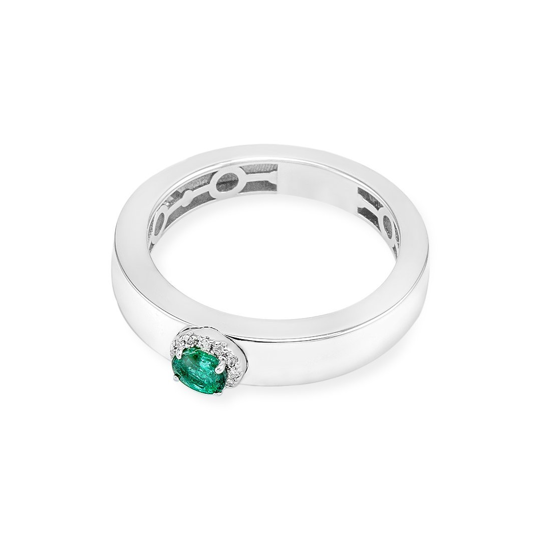 This white gold emerald ring brings together natural color and refined design in a timeless silhouette. The central 0.17-carat emerald offers a vivid green burst of life. Its rich hue stands out against polished 18k white gold. As a result, the ring feels both classic and modern. The sleek band guides focus to the stone. Therefore, it appeals to those who seek refined silhouettes.