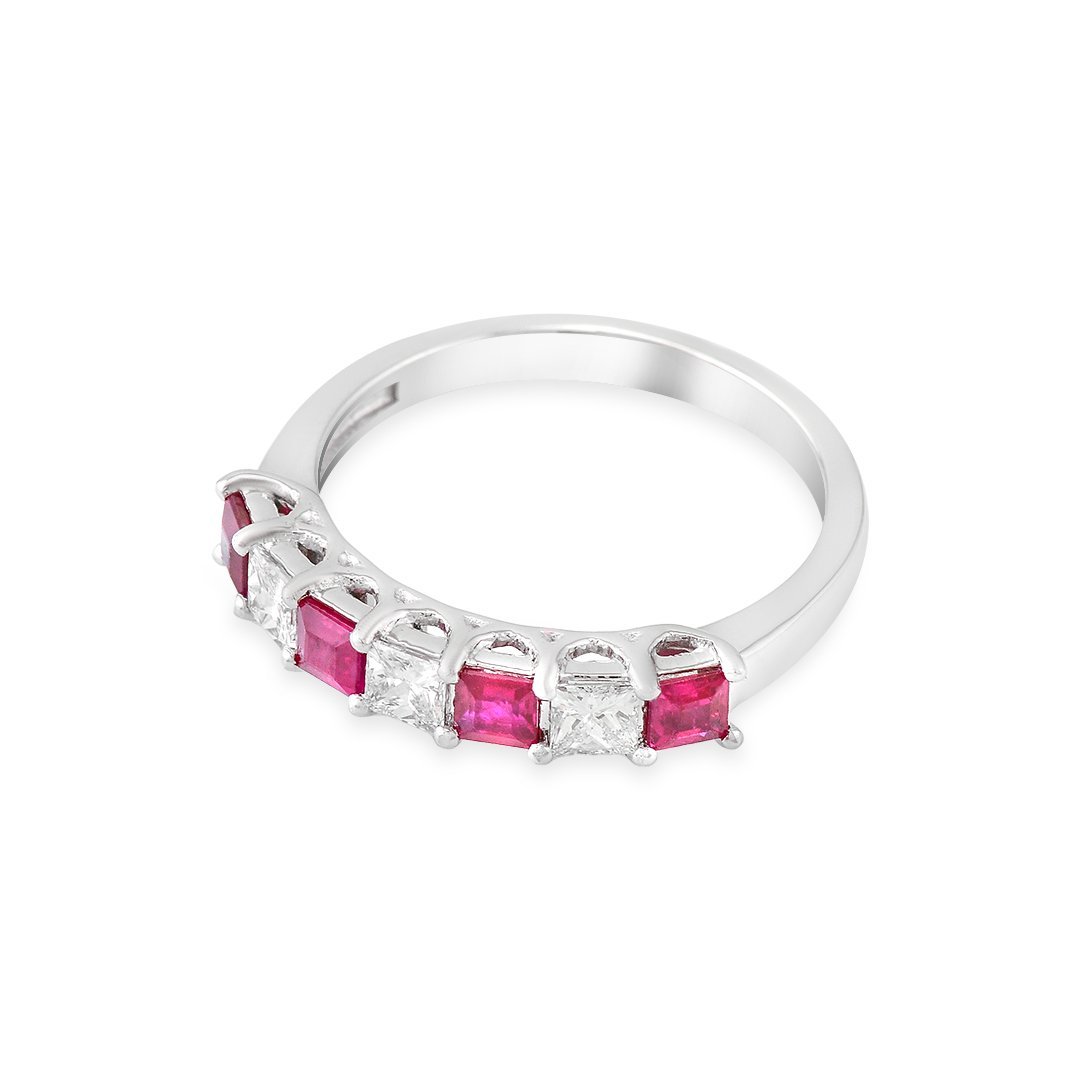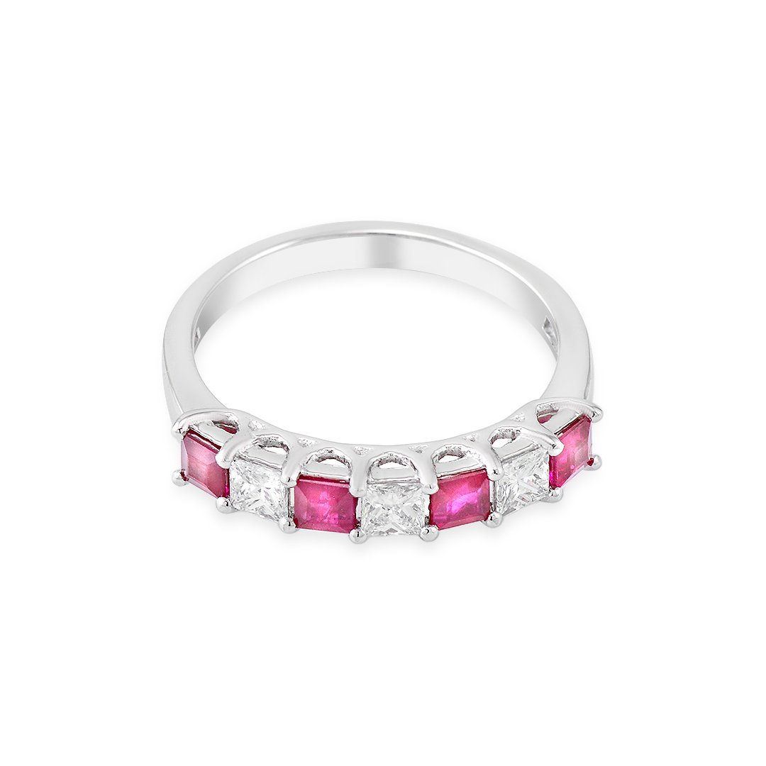 This white gold ruby and diamond band unites sharp geometry with rich color in one striking design. Crafted from polished 18k white gold, it features three princess-cut diamonds totaling 0.44 carats. Each diamond is graded VVS1 for clarity and F for color, ensuring crisp brilliance. Between these stones, four natural rubies totaling 0.71 carats add vivid contrast. The band balances structure and emotion with seamless grace.